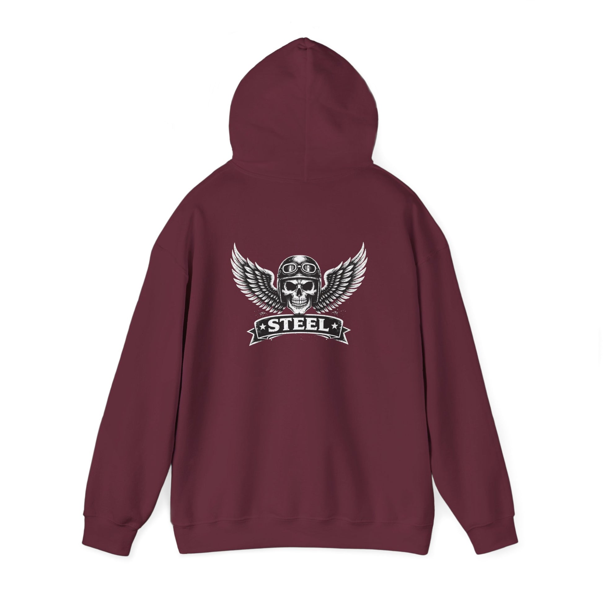 A midweight black hoodie with a gritty, vintage-inspired motorcycle emblem — a winged skull wearing aviator goggles over a curved “STEEL” banner. It settles in easily: roomy hood, color-matched drawcord, and a deep kangaroo pocket that keeps cold hands warm. The fabric blend gives a soft, broken-in feel while holding its shape and graphics. Wear it on early-morning rides, late-night garage hangs, or when you want a touch of road-worn attitude in everyday life.